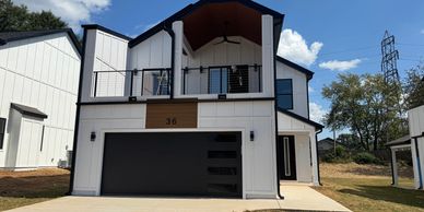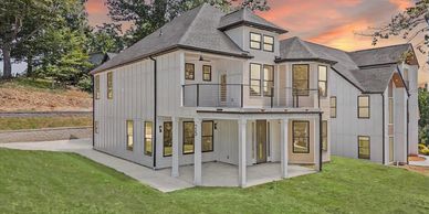 Upstairs, the private owner’s suite impresses with vaulted ceilings, abundant natural light, a large walk-in closet, and a spa-inspired bathroom with dual vanities and a rainfall shower. Two additional bedrooms with custom built-ins provide generous storage. Enjoy multiple covered porches, a private balcony with fireplace, and a custom patio—perfect for year-round relaxation or game-day gatherings. Situated on a level 0.25-acre lot with low-maintenance concrete plank siding, this home delivers style, efficiency, and convenience.